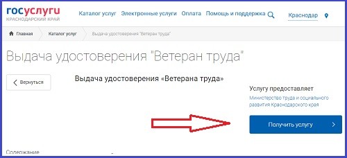 - выбираем услугу «Выдача удостоверения «Ветеран труда»;